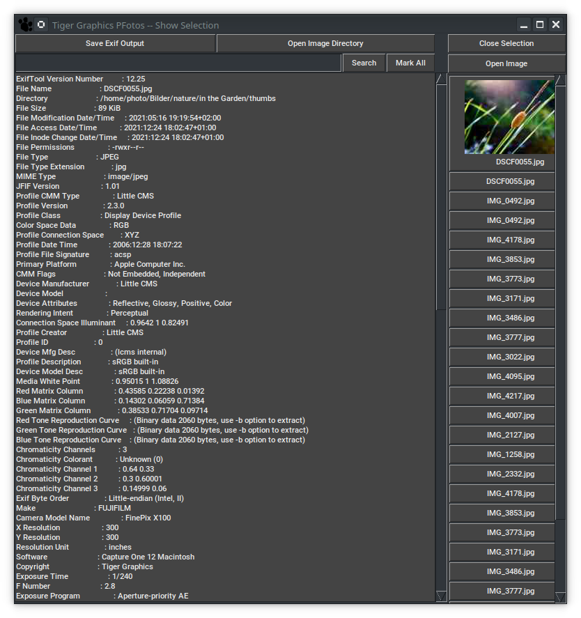 Clicking on one of the these thumbnail buttons results in an update of the left column showing the complete EXIF information provided by the image (this left column is also scrollable). Putting the mouse pointer over a thumbnail image displays the short EXIF information of the image as balloon tool tip.