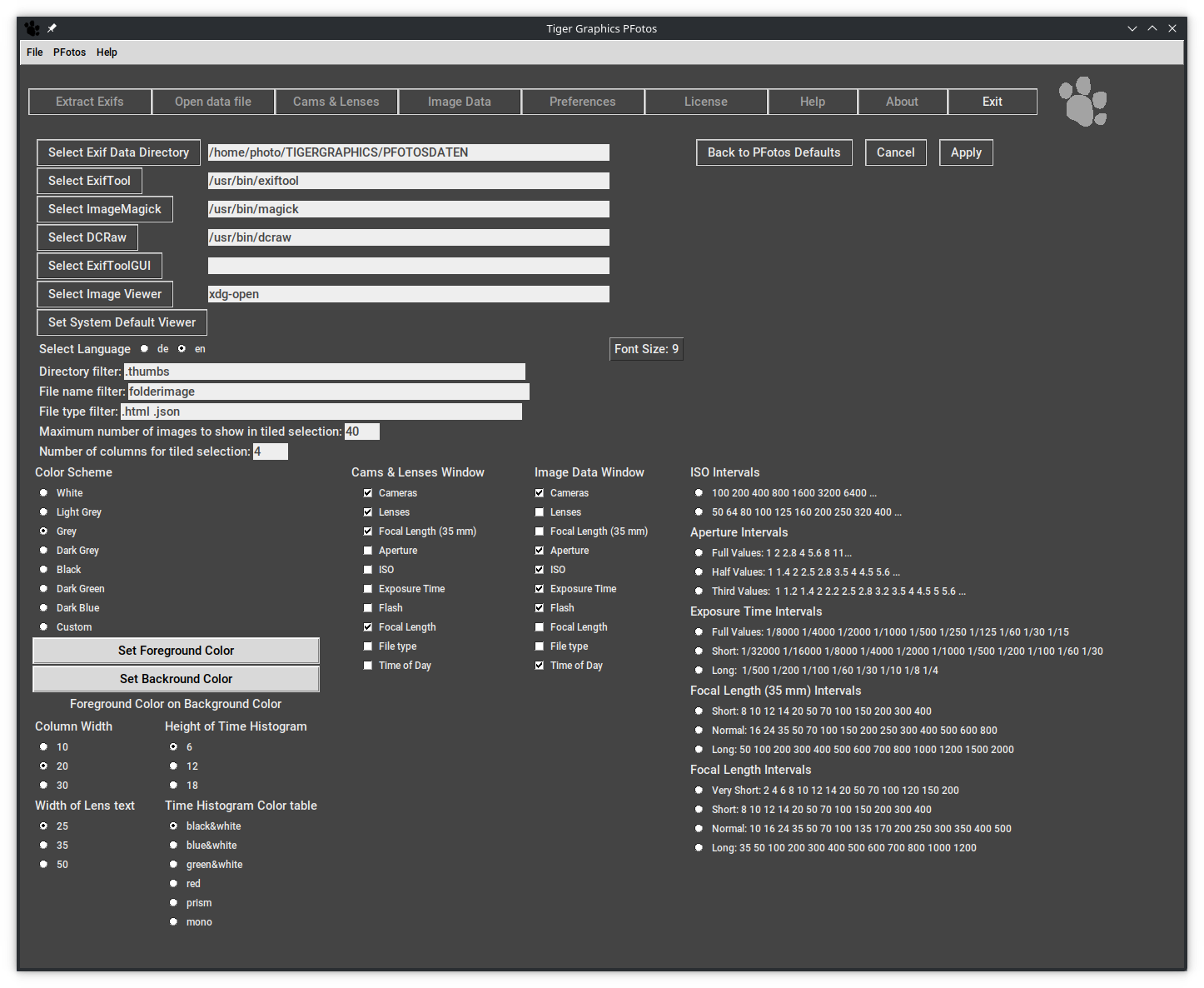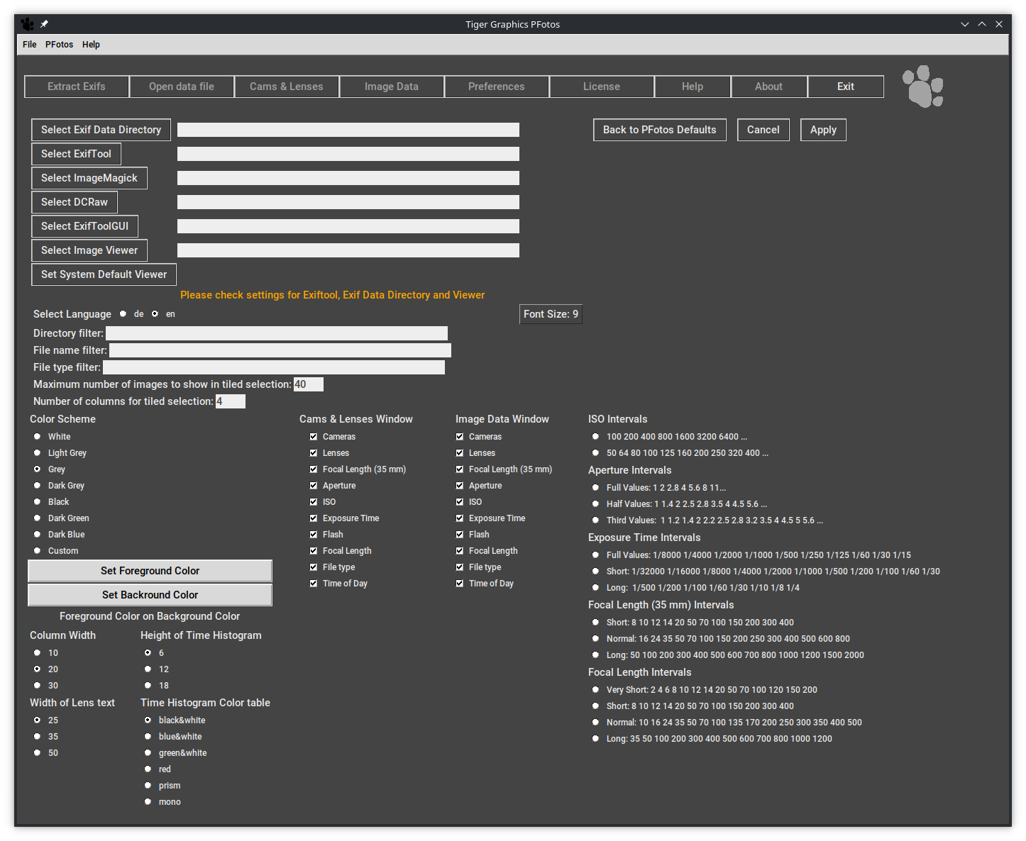 When PFotos is started for the first time on your computer, you will be directed to the Preferences tab to do some necessary preparations. First, the path to the PFotos data directory needs to be defined; in that directory, all the extracted EXIF-data from the inspected image directories will be stored. For details please have look into the preferences section Chapter 7.