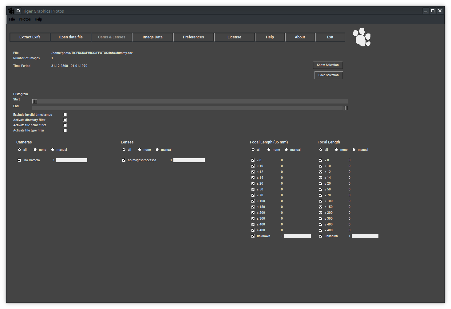 Obviously, after the very first installation, there are no PFotos data available and the included dummy data set is selected automatically.